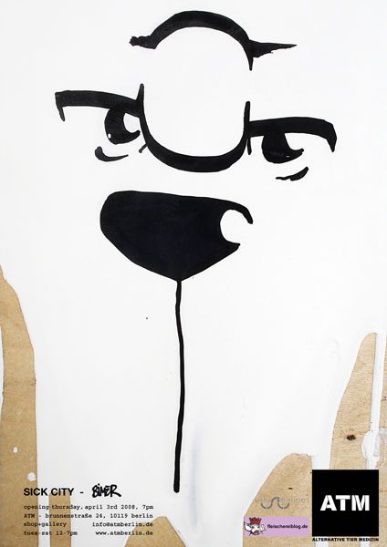 Sprayer, street kid, opportunity actor – the Berlin graffiti artist Bimer shows in his first solo exhibition “SICK CITY” not only a number of variations of his well known metropolitan characters but also some recent free style pictures. Bimer’s Berlin bear is one of the most noticeable street art characters in Berlin’s graffiti scene. The sometimes angry or sad looking bear can be found on numerous spots sometimes as huge wall piece as well as small marker sketch.