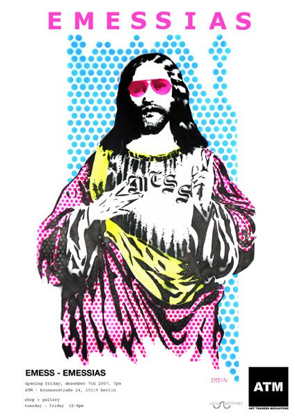 Once a ‘Meisterschueler’ at the Berlin UDK, EMESS has been working within the creative field for decades – confused by contemporary artscene EMESS found creative shelter in the freedom of urban space. For some time now Emess has expanded his spectrum and has been working as part of the Berlin street art scene, presenting his own signs to a more and more designed Environment. He primarily engages with themes such as the human itself, war, media, work. His provocative combinations and politically motivated images often act as some sort of reminder. By combining different pictograms the artist manages to achieve a meaning that is controversial to its original one. Picasso’s white pigeon, which symbolizes freedom, becomes the EMESS’ war pigeon. The artist achieves the transformation, which is significant for his work, by adding bombs that are falling out of a hole in the bird’s stomach area which refers to George Bush’s claim wanting to bring freedom by attaching Irak and throwing bombs. In his urban street-cosmos Emess creates gigantic art pieces by combining numerous posters to huge collages or his sprayed protagonists shout, greet or die in lifesize on walls or phonebooths. All of EMESS´ works have in common to question, to activate or to irritate– taking their power from the day-to-day reality of our medialised metropolitan life.