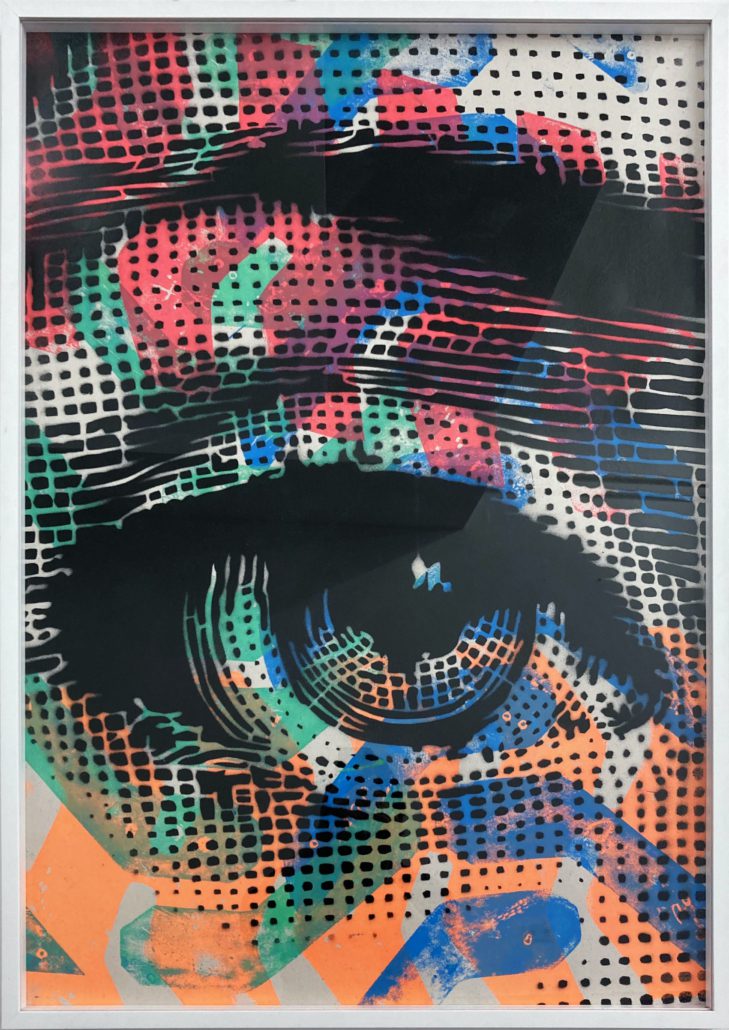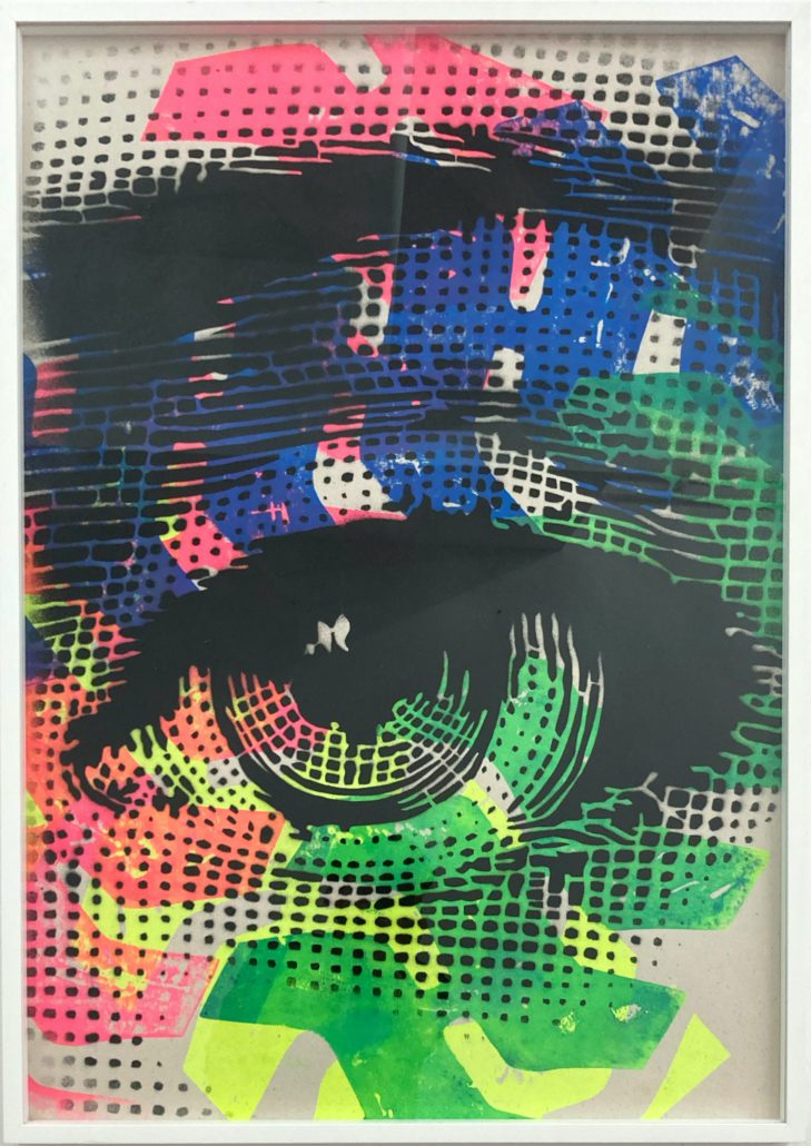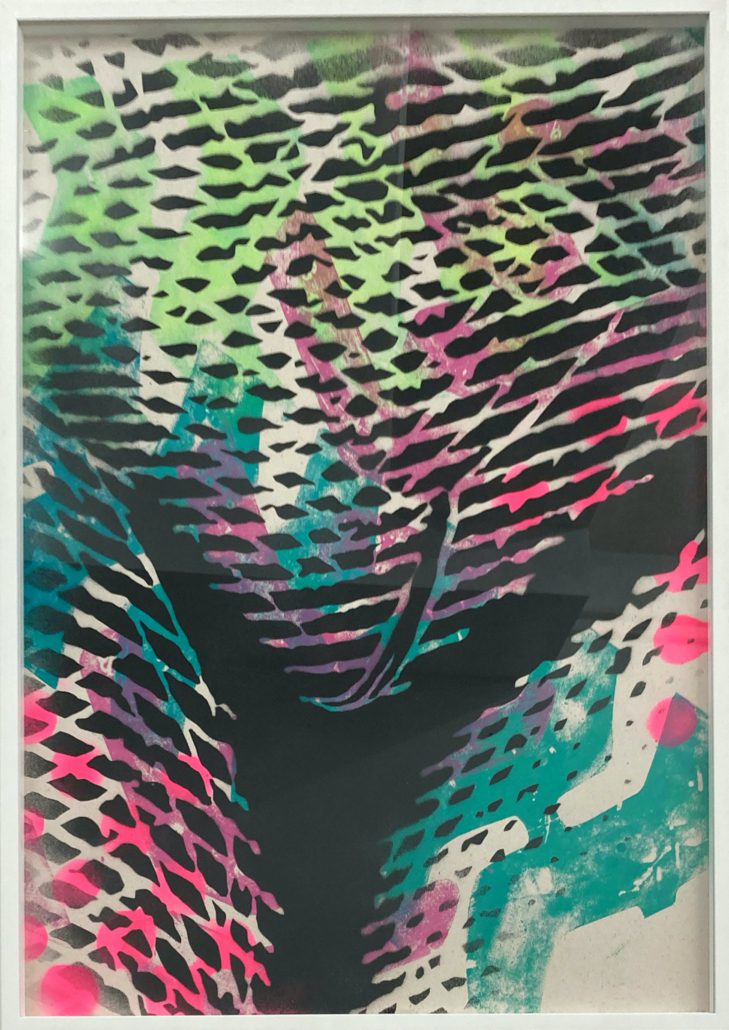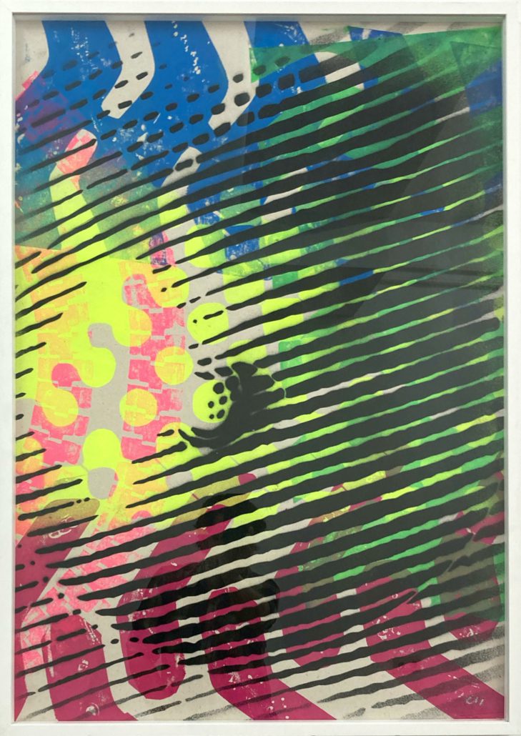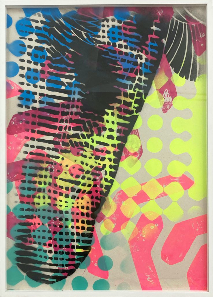 Stencil, spray paint & acrylic & loader tracks on recycled cardboard 320 gr