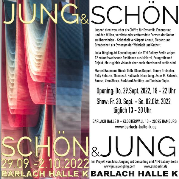 It is the desire for harmony between creative vitality and visual aesthetics that drives the 12 artists in the “JUNG & SCHÖN (“Young & Beautiful”) exhibition and is the motor of our artistic future.